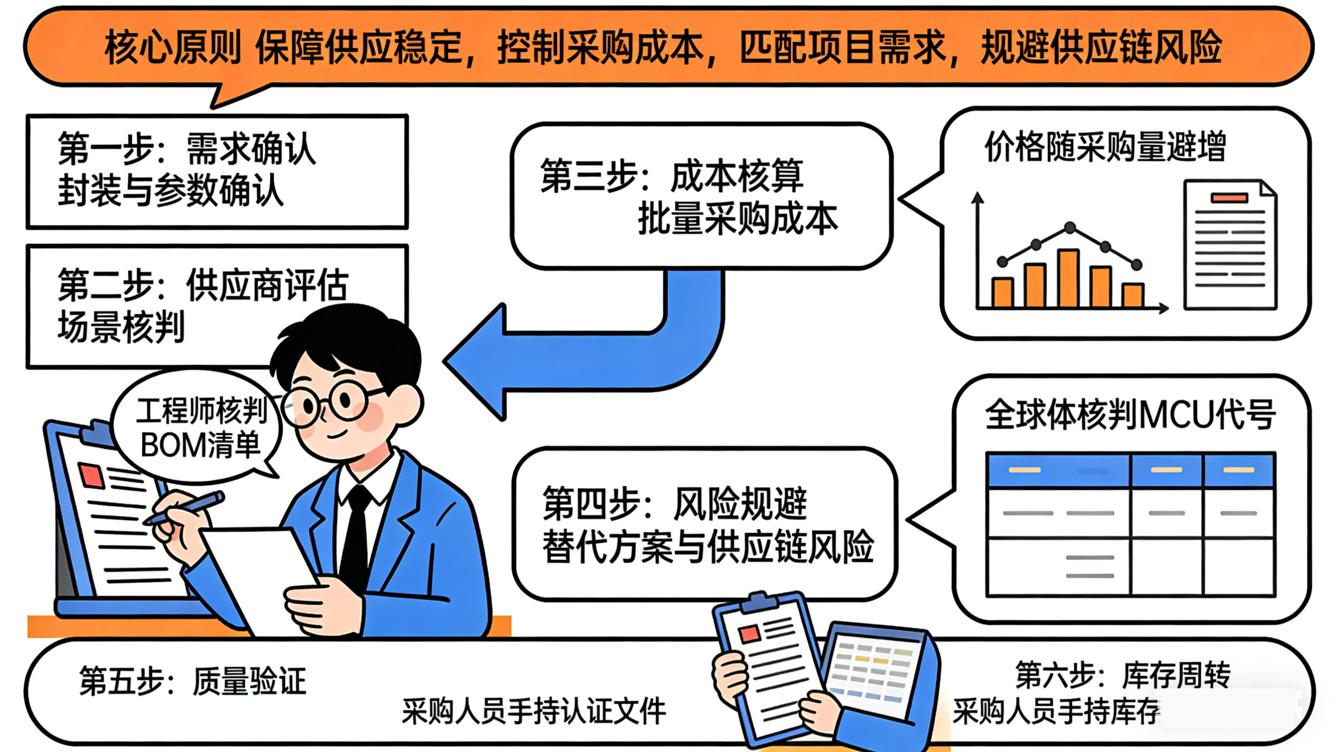 采购的核心原则是"保障供应稳定,控制采购成本,匹配项目需求,规避供应链风险",具体注意事项遵循"需求确认-供应商评估-成本核算-库存规划-风险规避"的科学流程:
