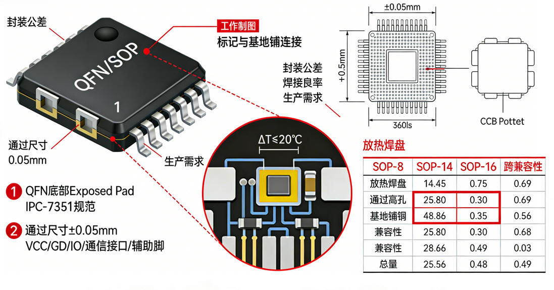 | SOP‑14 | 14 | 5.0 × 9.8 | 1.27(标准双列间距) | IO口数量充足,集成更多功能模块,性价比高,无底部散热焊盘,功耗≤300 mW | 双列直插表贴焊盘,焊盘宽度0.6 mm,长度1.5 mm,预留足够引脚间距(≥2 mm),方便调试与返修 | 中端MCU、家电控制板、工业传感器、批量生产嵌入式产品 |