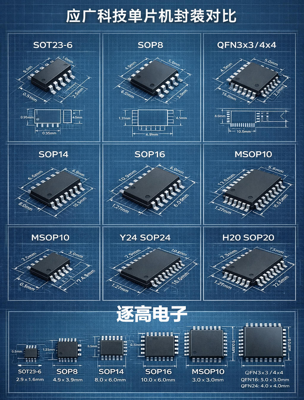 以下实物拍照+线稿叠加图,严格按照应广科技MCU数据手册绘制,清晰标注了各封装的关键尺寸、引脚定义(VCC、GND、IO、通信口、复位脚)、引脚1标记与PCB footprint对应关系,符合工程制图规范,工程师可直接参考进行PCB设计,采购人员可通过实物外观快速识别物料规格,避免采购错误: