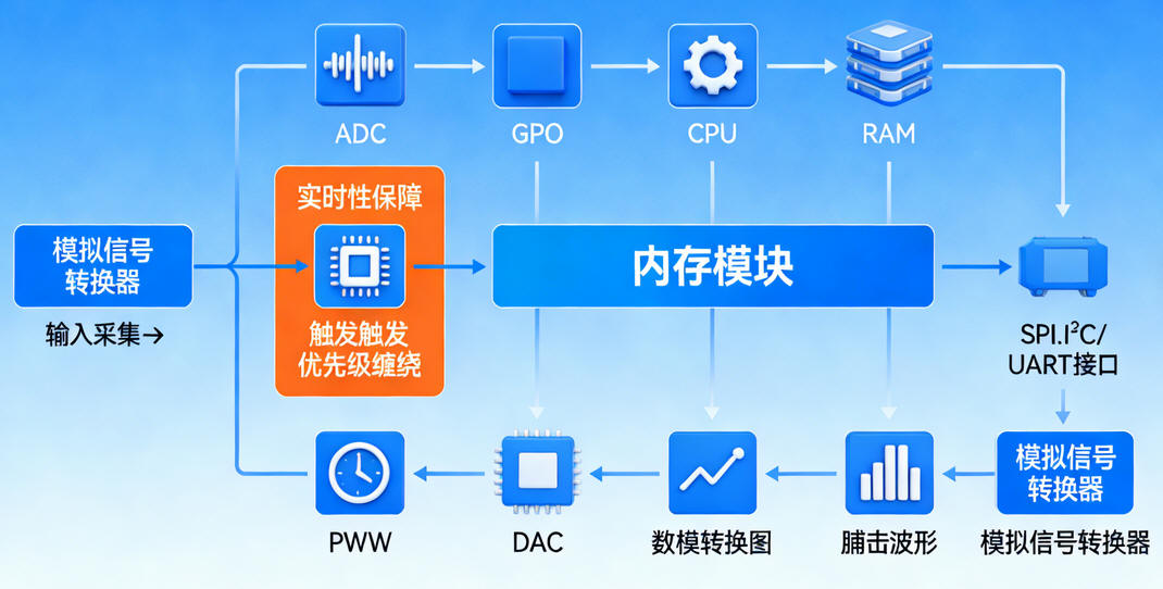 - 输入采集阶段(感知):通过GPIO口采集数字信号(按键、开关、外设状态),通过10-12位ADC模数转换器采集模拟信号(温度、湿度、压力、电压、电流),将连续的模拟信号转换为MCU可识别的离散数字信号(量化精度为LSB=参考电压/2^ADC位数);同时通过SPI/I²C/UART通信接口接收外部设备的指令数据,采集过程支持中断触发,避免轮询占用CPU资源,保障实时性。