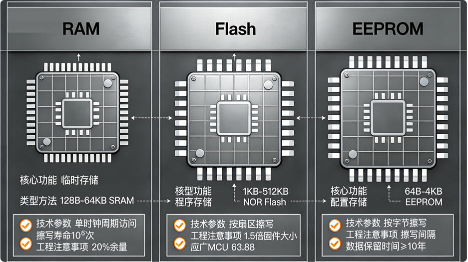 - 存储系统:分为易失性存储(RAM)和非易失性存储(Flash、EEPROM),是MCU存储程序和数据的核心载体,各类存储的功能、规格与特性存在明确差异(详细对比见下方科学对比卡片),无功能替代重叠。