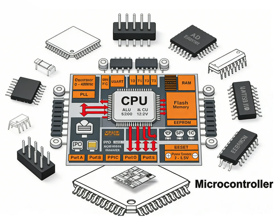 微控制器(Microcontroller Unit, MCU)是一种将中央处理器(CPU)、只读存储器(Flash/ROM)、随机存取存储器(RAM)、输入/输出接口(GPIO)、串行通信模块(SPI/I²C/UART)、定时/计数模块(Timer/Counter)及中断控制系统高度集成在单一半导体芯片上的专用嵌入式控制系统。
